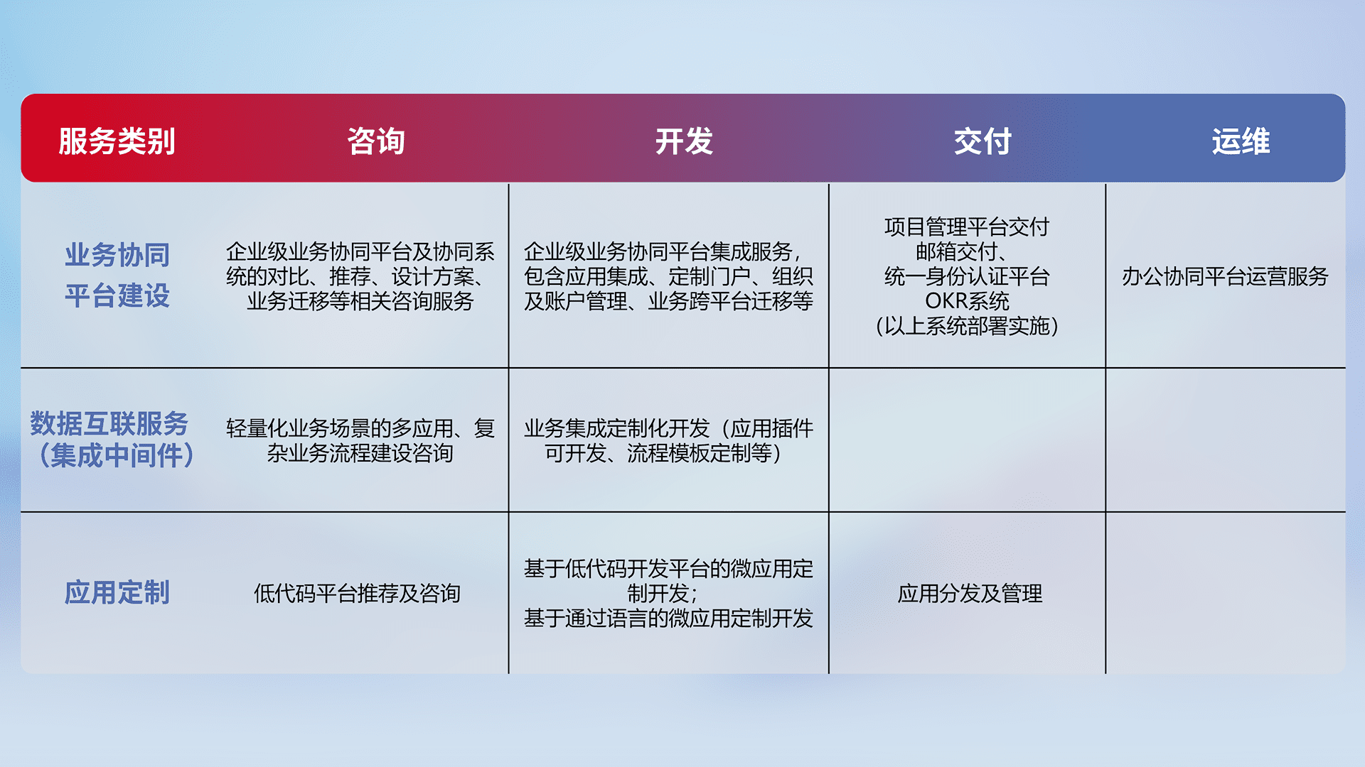 针对钉钉、、、、企微、、、、IDaas等平台级产品提供产品的规划、、、、方案、、、、交付、、定制化开发等服务,,实现如统一协同办公、、、、智能客户服务、、、、混合会议管理、、、智能数据查询、、、、等业务场景,,实现数字化转型。。。。